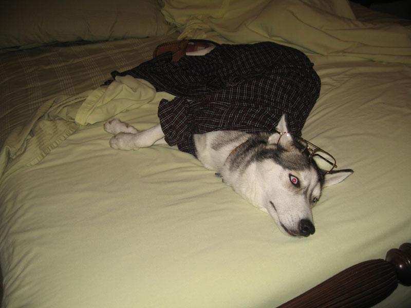Someone thought it would be funny to dress up Bella in my robe, house shoes and reading glasses.