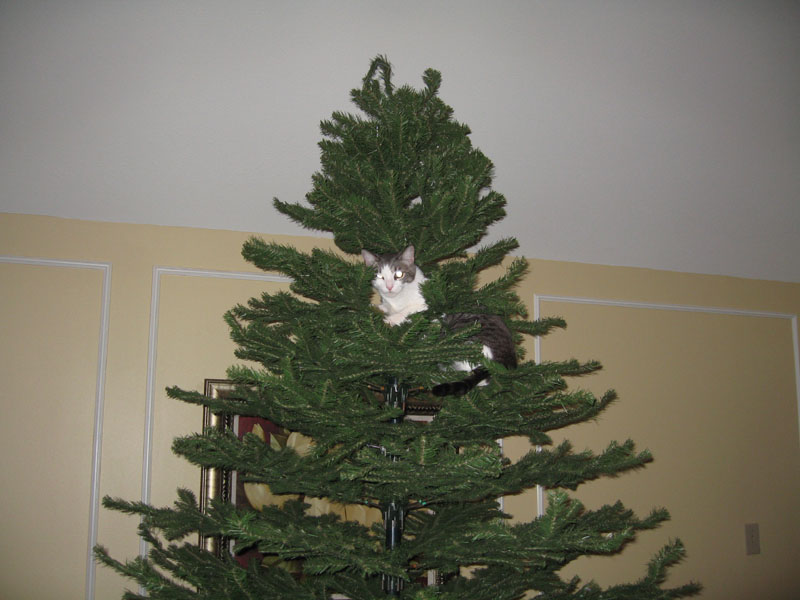 We've had this artificial tree for years and Hank likes to be the first ornament!